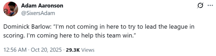 虎扑10月20日讯今日,在76人训练结束后,前锋多米尼克-巴洛接受了记者的采访,谈到了加盟76人的初衷。